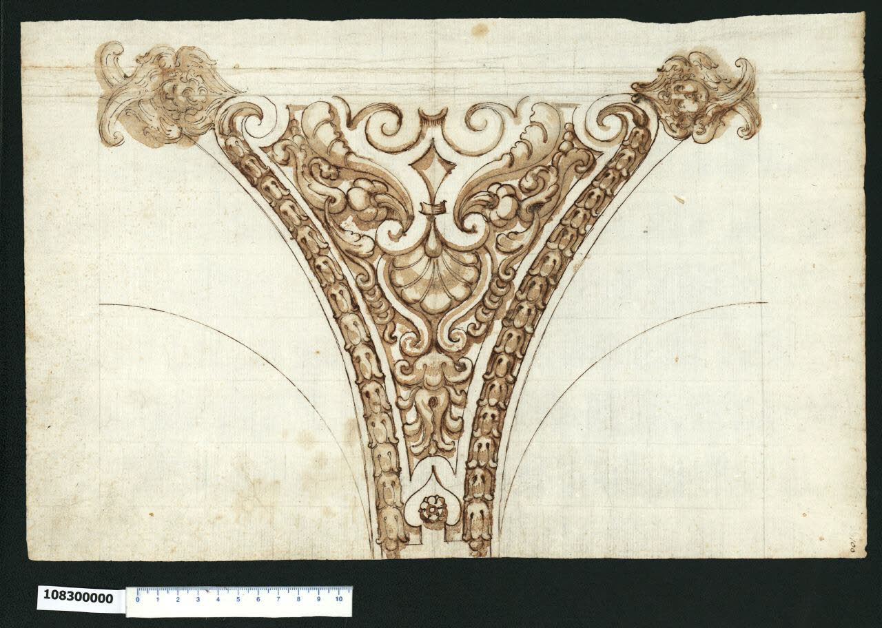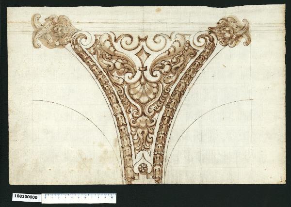 - NOTIZIE STORICO CRITICHE Nell'"Indice" del tomo nel quale era rilegato il disegno viene definito: "Ornato".\nDalla configurazione del disegno, si tratta probabilmente della decorazione di un pennacchio, ossia una superficie di raccordo alla base di una cupola o tra arcate contigue. Il decoro è costituito da un motivo centrale ornamentale a volute che sostiene alla base un ventaglio di petali ed è circondato da viticci fioriti. Questo motivo è racchiuso tra due fasce a campanule ricorrenti che si dipartono da due volute, a lato delle quali si trovano due teste di cherubino di diversa fattura con le ali ripiegate incrociate. Non si è potuto stabilire l'autore del disegno, che presenta una finitura accurata ed effetti chiaroscurali riscontrabili in ambito centro-settentrionale.