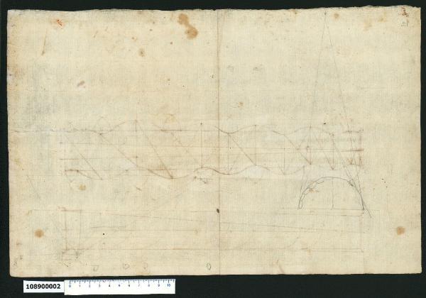 schizzi di studio, tracciati a grafite a mano libera con linee di costruzione a tiralinee, su supporto di carta chiara imbrunita