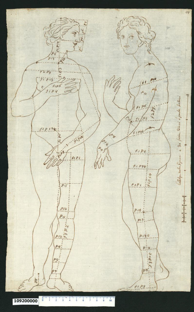 - NOTIZIE STORICO CRITICHE Nell'"Indice" del tomo nel quale era rilegato il disegno viene definito: "Misure della Venere medicea". \nIl disegno è una rappresentazione quotata della Venere Medici, vista da due angolazioni: la prima raffigura il corpo frontale con il capo girato di profilo e la seconda il profilo sinistro del corpo col viso rivolto frontalmente. La Venere Medici è una statua greco-ellenistica in marmo del I sec. a.C, giunta a Roma nell'antichità. L'opera, che ritrae Venere al bagno nella posizione pudica ispirata alla Venere Cnidia di Prassitele del IV-III sec. a.C., risulta documentata con certezza come appartenente a Villa Medici di Roma dalle incisioni di Perrier del 1638, ma potrebbe essere già stata presente nel 1598, anno in cui era già documentata nella nota di un epigrafista; fu trasportata in seguito a Firenze e collocata nella Tribuna degli Uffizi nel 1688. Inviata con altri tesori a Palermo nel 1800 per sfuggire ai Francesi, fu invece spedita dopo una trattativa a Marsiglia nel 1802 ed entrò al Musée di Parigi nel 1803, ma ritornò a Firenze nel 1815 riprendendo il suo posto nella Tribuna degli Uffizi, temporaneamente occupato dalla Venere Italica di Antonio Canova (F. Haskell, N. Penny, L'antico nella storia del gusto. La seduzione della scultura classica 1500-1900, trad. it. R. Pedio, Torino 1984). La Venere è una delle sculture più copiate di ogni tempo. Già nel 1678 Cosimo III aveva inviato a villa Medici artisti come Giovan Battista Foggini (1652-1725) e Massimiliano Soldani Benzi (1656-1740) per formarsi su capolavori antichi della collezione medicea. Soldani Benzi realizzò tra il 1698 e il 1702 per il principe Johann Adam Andreas I di Liechtenstein due statue in bronzo di grandi dimensioni raffiguranti il "Fauno" e la "Venere Medicea", che saranno riproposti nel 1747 in porcellana da Carlo Ginori, fondatore nel 1737 della manifattura Doccia nei pressi di Firenze. Molta della produzione di Doccia è copiata dai bronzi dei maggiori scultori del Barocco fiorentino, dai cui eredi Carlo Ginori aveva comprato diversi modelli in cera e terracotta e alcune forme. Inoltre Ginori aveva impiegato in fabbrica alcuni lavoranti precedentemente attivi presso Soldani e Foggini che avevano già eseguito calchi e forme per i loro maestri.\nNon vi sono elementi per poter attribuire il disegno in esame, ma si può sottolineare che è stato minuziosamente misurato ogni dettaglio dell'anatomia della dea e che disegni similmente rilevati sono presenti tra le rappresentazioni di Abraham Bosse del 1656, conservate al British Museum di Londra (A. Bosse, Representation de diverses figures humaines. Avec leurs mesures prises sur des Antique qui sont de present a Rome, Paris 1656). Occorre rilevare anche che, rispetto all'originale, non è presente il delfino con putti alla base della statua. La filigrana riporta il disegno di un giglio con accanto le iniziali M e T, inscritto in un tondo sovrastato da una corona.