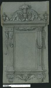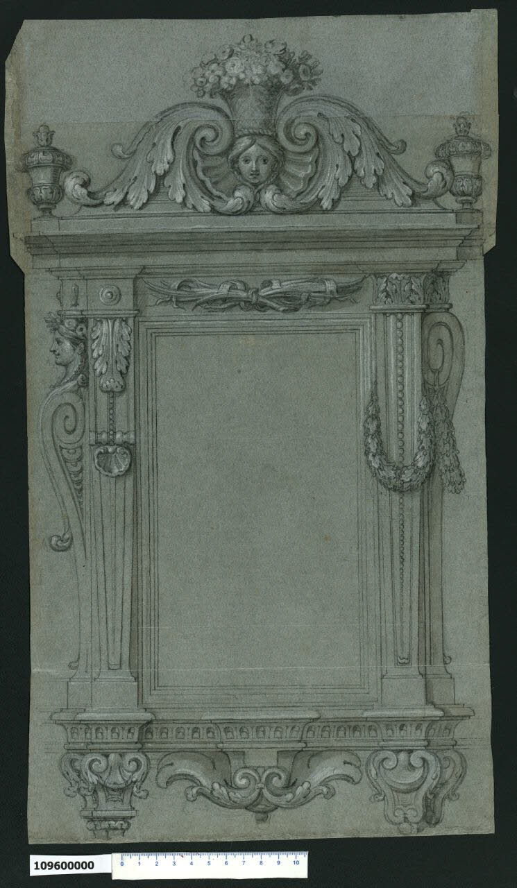 - NOTIZIE STORICO CRITICHE Nell'"Indice" del tomo nel quale era rilegato al disegno corrisponde probabilmente la definizione: "Ornati per Fregio".\nAttribuito da Hellmut Lorenz a Domenico Martinelli (Lorenz 1991, p. 321 MZ 327), sembra appartenere insieme ad altri esemplari presenti all'interno della Collezione con le stesse caratteristiche stilistiche (Milano, Collezione Sardini Martinelli invv. 4,9; 8,93; 9,1 e 9,20), a una serie i disegni eseguiti dall'architetto lucchese nel primo periodo della sua attività a Roma, tra il 1678 e il 1690.\nIl disegno, tracciato a matita nera su carta verde con luminescenze rilevate a biacca, presenta il progetto per una cornice decorativa al cui centro doveva probabilmente essere inserita un'immagine. La parte superiore è sormontata da una testina che sostiene un vaso di fiori, inserita in una sorta di conchiglia circondata da due volute di motivi vegetali. Ai lati di questa composizione sono poste due urne cinerarie. La riquadratura interna è sovrastata da due foglie di palma intrecciate legate da nastri - motivo di chiara ascendenza Borrominiana ripreso da Martinelli - mentre ai lati è affiancata da lesene decorate in modo differente l'una dall'altra, così da proporre contemporaneamente due versioni dello stesso progetto. A sinistra la lesena è costituita da un fusto rastremato decorato nella parte superiore con una conchiglia e una mensola ornata da una foglia d'acanto e perline. Questa sostiene un capitello cubico con motivo tondeggiante al centro, che si ripropone lateralmente, questa volta sostenuto da un'erma, costituita da una testina su voluta.\nLa variante a destra propone lo stesso tipo di lesena rastremata ornata con una semplice fila centrale di perline, che sostiene però un capitello a foglie d'acanto. Lo stesso capitello riproposto lateralmente, è sostenuto da una voluta appiattita, al cui occhio è appesa una ghirlanda che avvolge la lesena frontale. Questo motivo ricorda le mensole che sostengono la parte superiore del portale centrale nella chiesa di S. Ignazio a Roma, disegnato da Orazio Grassi.\nLa parte inferiore sagomata della cornice presenta un pendente centrale con un motivo di cartigli e foglie che nasce da due volute contrapposte. Ai lati, in corrispondenza delle lesene soprastanti, sono invece due mensole di disegno diverso, ma impostato in entrambe su motivo a volute con conchiglia centrale.