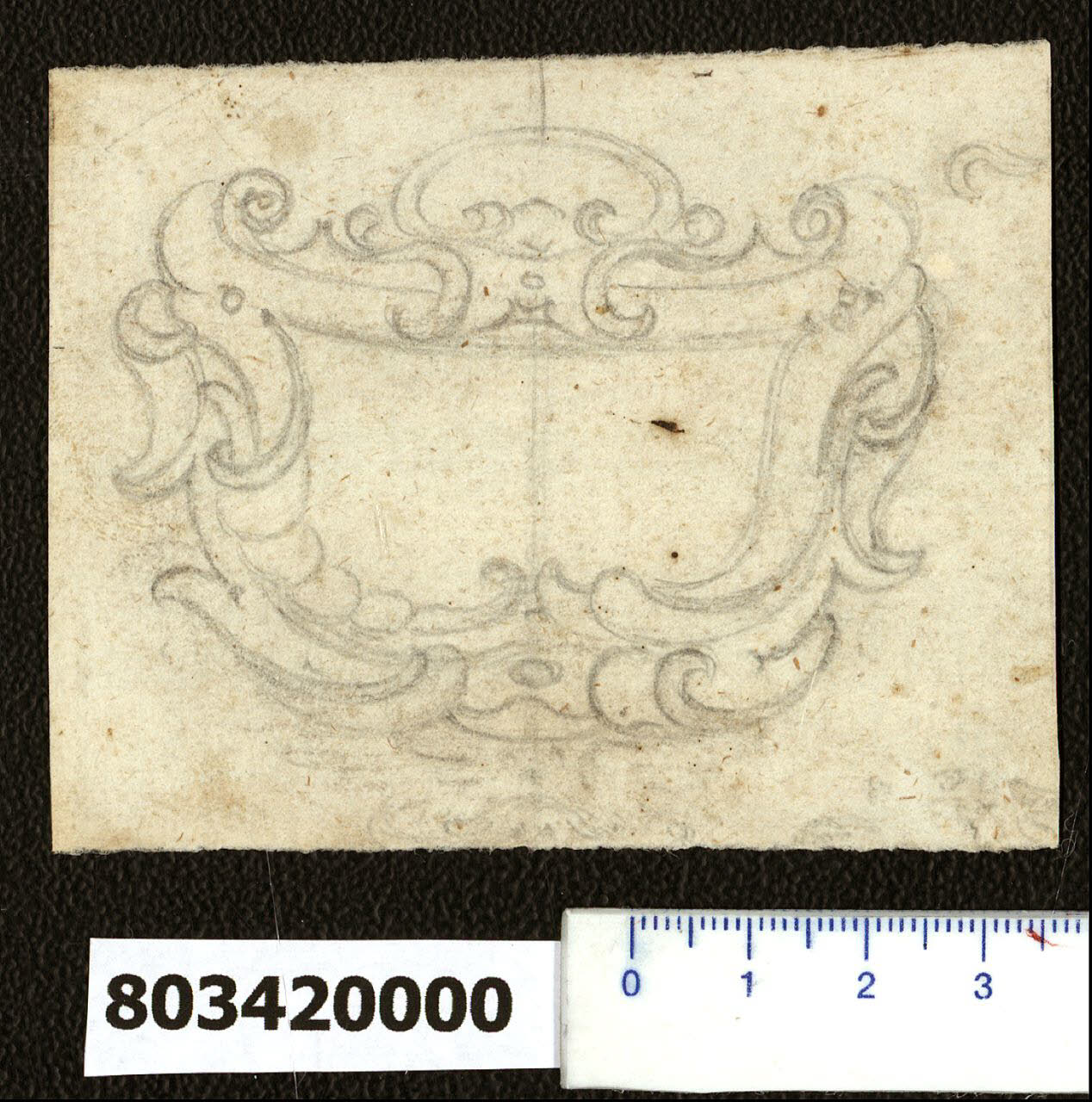 - NOTIZIE STORICO CRITICHE Nell'"Indice" del tomo nel quale era rilegato il disegno viene raggruppato con quello di cui all'inv. 8,34 R sotto il titolo: "Cimasa di porta e cartella".\nIl disegno, di cui non è stato possibile identificare l'autore, riporta due soluzioni alternative rispetto alla mezzeria per una cartella probabilmente concepita per un'iscrizione. Le differenze riguardano la disposizione dei cartigli laterali arricciati, mentre comune è il motivo centrale soprastante, costituito da un cartiglio pure arrotolato sormontato da una forma arrotondata e stilizzata di conchiglia. La cartella sembra sostenuta da una maschera.