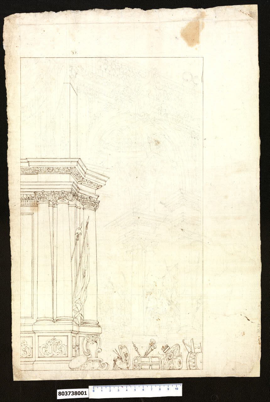 - NOTIZIE STORICO CRITICHE Nell'"Indice" del tomo nel quale il marchese Giacomo Sardini lo aveva rilegato, il disegno viene definito: "37. Prospettiva teatrale". La fermezza e la precisione del segno grafico, del tutto privo di brio specialmente nella porzione sinistra del foglio ornata a penna, lascerebbe supporre che la scenografia architettonica qui tracciata rappresenti la copia pedissequa derivata da un modello che allo stato attuale non è possibile specificare. Si tratterebbe in tal caso dell'esercitazione di un artista avviato all'apprendimento delle regole prospettiche in vista dell'instradamento verso la professione di scenografo teatrale. Se è difficile pronunciarsi sugli esiti spaziali e compositivi raggiunti nella sezione destra del disegno - condotto a matita con un segno davvero molto labile, quasi impercettibile - una certa approssimazione nella resa degli scorci e una qualche rigidità nella descrizione degli strumenti musicali e delle insegne guerresche allineate in primo piano sembrerebbero confermare che il disegno costituisce la prova grafica eseguita con finalità didattiche da un giovane artista non ancora del tutto padrone dei propri mezzi espressivi. Non è dato sapere se il Sardini alludesse anche a questa prospettiva teatrale, di lontana eco bibienesca, assegnando al volume VIII della sua collezione che la contiene il titolo "Disegni d'Ornato ed altro di Bibbiena, del Mitelli, del Colonna, e di altri Architetti e Pittori".