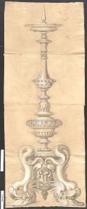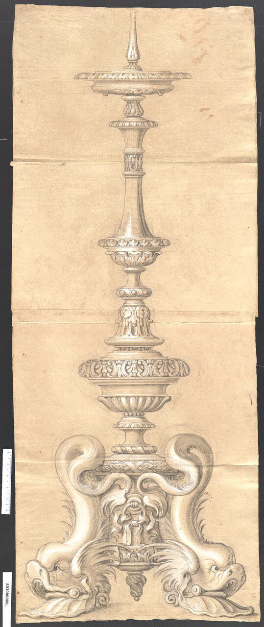 - NOTIZIE STORICO CRITICHE Nell'"Indice" del tomo nel quale era rilegato il disegno viene definito: "Candelabro del Martinelli". \nIl disegno raffigura un candeliere ed è un'opera di Domenico Martinelli, di cui è presente il nome tracciato a matita, anche se poco leggibile, sul verso del foglio. Secondo Hellmut Lorenz (Lorenz 1991, M-KAT84 p. 264) l'attività di Martinelli come progettista di oggetti d'artigianato e arredi sacri, non documentata ma chiaramente a lui attribuibile, può essere plausibile solo per quei committenti come il conte Dominik Andreas Kaunitz che affidò all'architetto tutte le attività relative ai suoi beni e in particolare i dettagli decorativi relativi al castello e alla chiesa di Austerlitz. \nIn seguito a queste considerazioni e ad alcuni dettagli di due altri candelieri presenti nella collezione (Milano, Collezione Sardini-Martinelli, invv. 8,39bis, 8,39ter R e V), Lorenz ritiene che il periodo di realizzazione della serie di questi oggetti possa coincidere o seguire immediatamente il soggiorno di Martinelli in Italia tra il 1699 e il 1700, quando entrò in contatto con lo scultore toscano Massimiliano Soldani e le opere di Pietro da Cortona. \nDiversi disegni di candelieri e altri oggetti liturgici, alcuni anche appartenenti al lucchese Gerolamo Scaglia, si trovano in uno dei manoscritti di Martinelli (Biblioteca Statale di Lucca, ms 1855). \nIl candeliere raffigurato nel disegno in esame si distingue per i due supporti simmetrici a forma di mostri marini, con il muso appoggiato sopra una conchiglia rovesciata, i corpi che percorrono il basamento e le code che si incontrano con curve sinuose al centro, in corrispondenza di un anello con nastri annodati e intrecciati. Lungo il fusto si sussegue una serie di elementi modanati e decorati con serti d'alloro, nastri arrotolati, perline, motivi vegetali e file di piccole conchiglie, fino ad arrivare al piccolo bacile che raccoglie la cera. \nIl disegno è realizzato con una tecnica consueta a Martinelli, dove i giochi di luce e le ombreggiature riescono a offrire una realistica resa tridimensionale dell'oggetto.\nSul verso del foglio è tracciato uno schizzo a matita nera non identificabile.