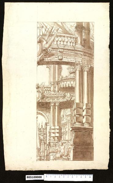 - NOTIZIE STORICO CRITICHE Nell'"Indice" del tomo nel quale il marchese Giacomo Sardini lo aveva rilegato, il disegno viene definito: "Prospettiva scenica". Questo studio corrisponde, seppure in controparte, al settore sinistro del disegno inv. n. 310 del Museu Nacional de arte antiga di Lisbona (disegno a penna acquerellato a seppia, mm 315 x 282: scheda di autore non indicato, in Desenhos dos Galli Bibiena. Arquitectura e Cenografia, catalogo della mostra, Lisboa 1987, scheda 37, p. 51 e scheda di autore non indicato, in Meravigliose scene. Piacevoli inganni. Galli Bibiena, catalogo della mostra (Bibbiena), Arezzo 1992, scheda 24, p. 152), eseguito nel 1719 da Francesco Galli Bibiena in preparazione della scenografia con "Anfiteatro pomposamente ornato" dell'opera Lucio Vero o il Vologeso (primo atto, scena terza). Il foglio portoghese spetta quindi a un membro della famiglia di pittori, architetti e scenografi teatrali, originaria di Bibbiena in Toscana, e attiva, con grande successo, non solo in Italia, ma anche nelle principali corti europee. Rispetto alla versione di Lisbona, che nella parte destra presenta una diversa proposta per la stessa scenografia, il disegno milanese mostra alcune varianti tanto da far pensare non ad una copia pedissequa ma piuttosto ad un pensiero, già abbastanza ben definito nelle linee e nei motivi decorativi principali, prodotto in una fase non troppo avanzata dell'elaborazione progettuale. Realizzato con sicurezza e velocità di tocco - seppure con qualche approssimazione nella resa prospettica di alcuni particolari, come la volta della galleria semicircolare in secondo piano - mediante la successione di diversi livelli spaziali, la complessa costruzione architettonica riesce a ingannare l'osservatore dandogli l'illusione della profondità. Nel disegno si riconoscono molti elementi strutturali e decorativi ricorrenti nei progetti bibieneschi, in particolare di Francesco e Giuseppe. Significativa riguardo all'interesse nutrito dal Sardini nei confronti delle creazioni dei membri della famiglia Bibiena, è la dichiarazione che si legge in uno dei suoi manoscritti conservati nel fondo di famiglia presso l'Archivio di Stato di Lucca: "nella mia raccolta io ne possiedo di questo valentuomo [Carlo Galli Bibiena] dei Disegni diversi di architettura in prospettiva toccati ad acquarello di vari colori, e lumeggiati di biacca da' quali si può rilevare il suo valore anche nello stile della buona architettura ma piu nel far comparire quelle lontananze per le quali giunse egli a formare illusione nella gran sala del Principe di S. Severo" (Lucca, Archivio di Stato, Sardini 102, Studii e bozze per Opere d'Architettura, cc. sciolte e nn.). E' probabile che, tra gli altri, il collezionista alludesse anche a questo foglio quando decideva di assegnare al tomo VIII nel quale veniva rilegato il titolo "Disegni d'Ornato ed altro de Bibbiena, del Mitelli, del Colonna, e di altri Architetti e Pittori".