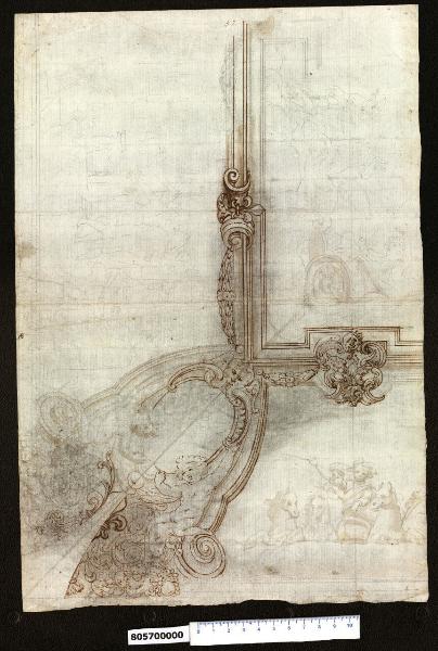 - NOTIZIE STORICO CRITICHE Nell'"Indice" del tomo nel quale era rilegato il disegno viene definito: "Soffitto forse nel palazzo Barberi- / ni di P. da Cortona".\nIl disegno,che non è stato possibile identificare, raffigura uno studio parziale per la decorazione di un soffitto. Il padiglione rettangolare centrale è raccordato agli spigoli tramite una composizione decorativa, formata da una cornice lobata conclusa da riccioli sui quali sono seduti due putti; questi reggono un medaglione ornato all'estremità superiore da un mascherone. Negli spazi lasciati liberi dalla decorazione in stucco sono raffigurate a monocromo scene mitologiche con carri trainati da cavalli alati.