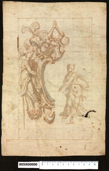 - NOTIZIE STORICO CRITICHE Nell'"Indice" del tomo nel quale era rilegato il disegno viene definito: "Cartella figurata per Arme / di ...".\nIl disegno in esame, eseguito all'interno di una griglia costruttiva modulare, raffigura due soggetti: una cartella per arme gentilizia rappresentata solo nella parte sinistra, essendo l'altra presumibilmente simmetrica e una figura femminile drappeggiata in movimento, che non sembra avere attinenza con il disegno a fianco.\nLa cartella circondata dai classici cartigli arricciati in volute, è sorretta da un'altra figura femminile drappeggiata, che poggia il piede su una ghirlanda di frutti e fiori intrecciati con nastri. La parte superiore della cartella riporta un cimiero da cui si elevano due braccia con le mani giunte verso l'alto in preghiera, circondato da un folto intreccio di fronde vegetali arricciate in volute.\nParte del disegno della cartella sembra essere stato ripreso a grafite sul verso.\nIl disegno potrebbe essere associato stilisticamente a un altro presente all'interno della Collezione (Milano, Collezione Sardini Martinelli, inv. 8,92), per le caratteristiche dei volti femminili e per la definizione del soggetto all'interno di una griglia costruttiva.