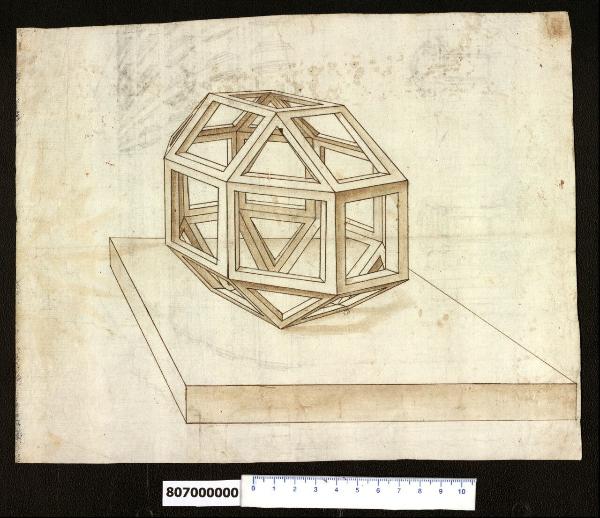 - NOTIZIE STORICO CRITICHE Nell'"Indice" del tomo nel quale era rilegato il disegno viene raggruppato con altri sotto il titolo: "Corpi disegnati con figure geometriche".\nIl disegno rappresenta un modello in legno di poliedro, simile a quello illustrato da Leonardo da Vinci nel libro di fra Luca Pacioli "De divina Proportione" del 1509. Il poliedro è adagiato su un piano visto in prospettiva. Potrebbe trattarsi di un'esercitazione accademica.
