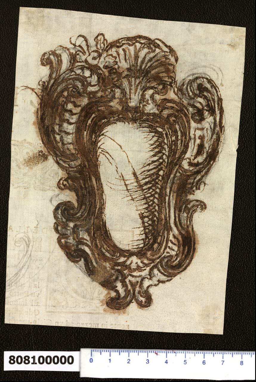- NOTIZIE STORICO CRITICHE Nell'"Indice" del tomo nel quale era rilegato il disegno viene raggruppato con altri sotto il titolo: "Cartelle per armi ".\nIl foglio in esame presenta una cartella per arme gentilizia attribuita da Hellmut Lorenz in forma dubitativa a Domenico Martinelli. La paternità del disegno sembra potersi confermare per analogia \ncon altri presenti all'interno della Collezione (Milano, Collezione Sardini Martinelli, invv. 8,87 R e V, 8,88 R e V) che forse costituiscono delle varianti di una stessa idea.\nLa cartella, il cui tratto grafico denota l'abbozzo veloce, è caratterizzata dalla presenza di cartocci con volute in due versioni differenti nel lato sinistro e destro della composizione, che si concludono in una conchiglia nella parte superiore, Sul lato sinistro la conchiglia è affiancata da un motivo vegetale con fiore. La parte centrale della cartella riporta una traccia di fascia diagonale, forse facente parte dello stemma gentilizio da inserire.\nIl disegno è tracciato su un foglio che riporta una iscrizione parziale e motivi decorativi stampati sul verso. Non vi è probabilmente attinenza con il disegno, anche se l'iscrizione può essere utile alla sua identificazione.