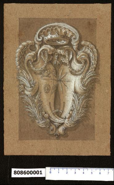 - NOTIZIE STORICO CRITICHE Nell'"Indice" del tomo nel quale era rilegato il disegno viene definito: "Cartelle per armi". \nLorenz (1991, MZ 451) conferma l'attribuzione a Domenico Martinelli e lo individua come stemma della famiglia Kaunitz-Sternberg. Dominik Andreas Kaunitz aveva sposato nel 1675 Maria Eleonore von Sternberg, gli emblemi delle rispettive casate sono riportati in questo stemma (a sinistra quello dei Kaunitz, a destra la stella a otto punte di un ramo dei Sternberg).