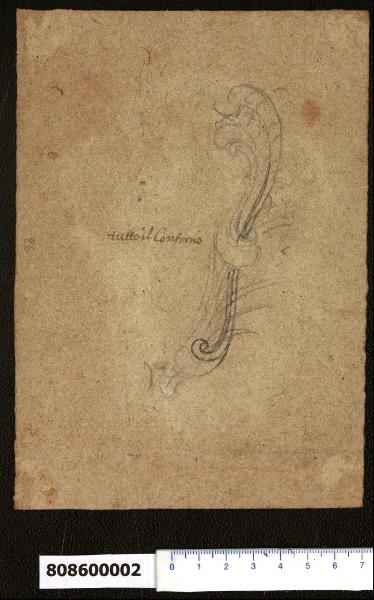 - NOTIZIE STORICO CRITICHE Il disegno raffigura la metà destra di un cartiglio definita da volute ed elementi vegetali; la scritta "tutto il contorno" fa pensare che il medesimo motivo andasse ripetuto anche per la metà sinistra. Sul foglio è tracciata anche un profilo virile.