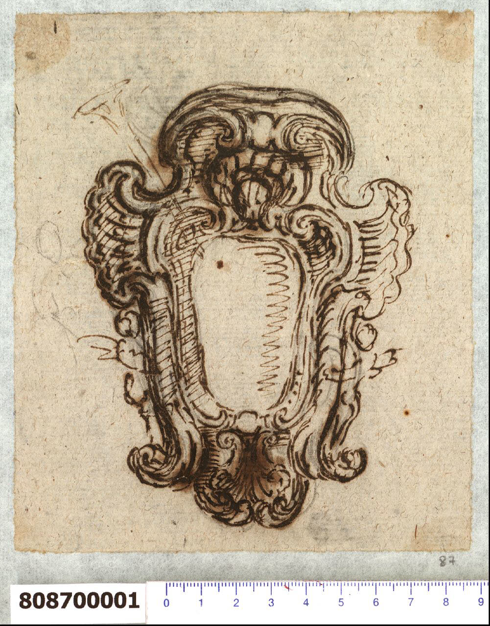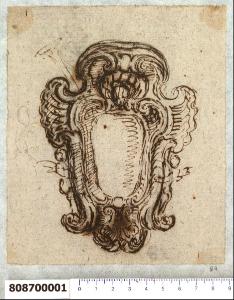 - NOTIZIE STORICO CRITICHE Nell'"Indice" del tomo nel quale era rilegato il disegno viene raggruppato con altri sotto il titolo: "Cartelle per armi ".\nIl foglio in esame presenta una cartella per arme gentilizia attribuita da Hellmut Lorenz a Domenico Martinelli. La paternità del disegno è confermata da analogie stilistiche e dai motivi decorativi tipici del repertorio martinelliano.\nLa cartella è caratterizzata dalla presenza di cartocci con volute, che racchiudono nella parte alta sopra il vuoto centrale che dovrebbe racchiudere lo stemma, una testina coronata appena abbozzata, ma che si ritrova in molte opere dell'architetto lucchese. Nella parte bassa è una conchiglia circondata da cartigli e motivi vegetali accartocciati. Una tromba appena accennata si eleva dal nucleo centrale della cartella sul lato sinistro, dove compare anche uno schizzo a grafite forse di figura umana.\nIl disegno può essere correlato ad altri presenti all'interno della Collezione (Milano, Collezione Sardini Martinelli, invv. 8,81; 8,87 V; 8,88 R e V) che forse sono varianti dello stesso soggetto.\nUno schizzo con soggetto simile è presente anche su un foglio di uno dei manoscritti di Martinelli (Biblioteca Statale di Lucca, ms 1855 f. 82).