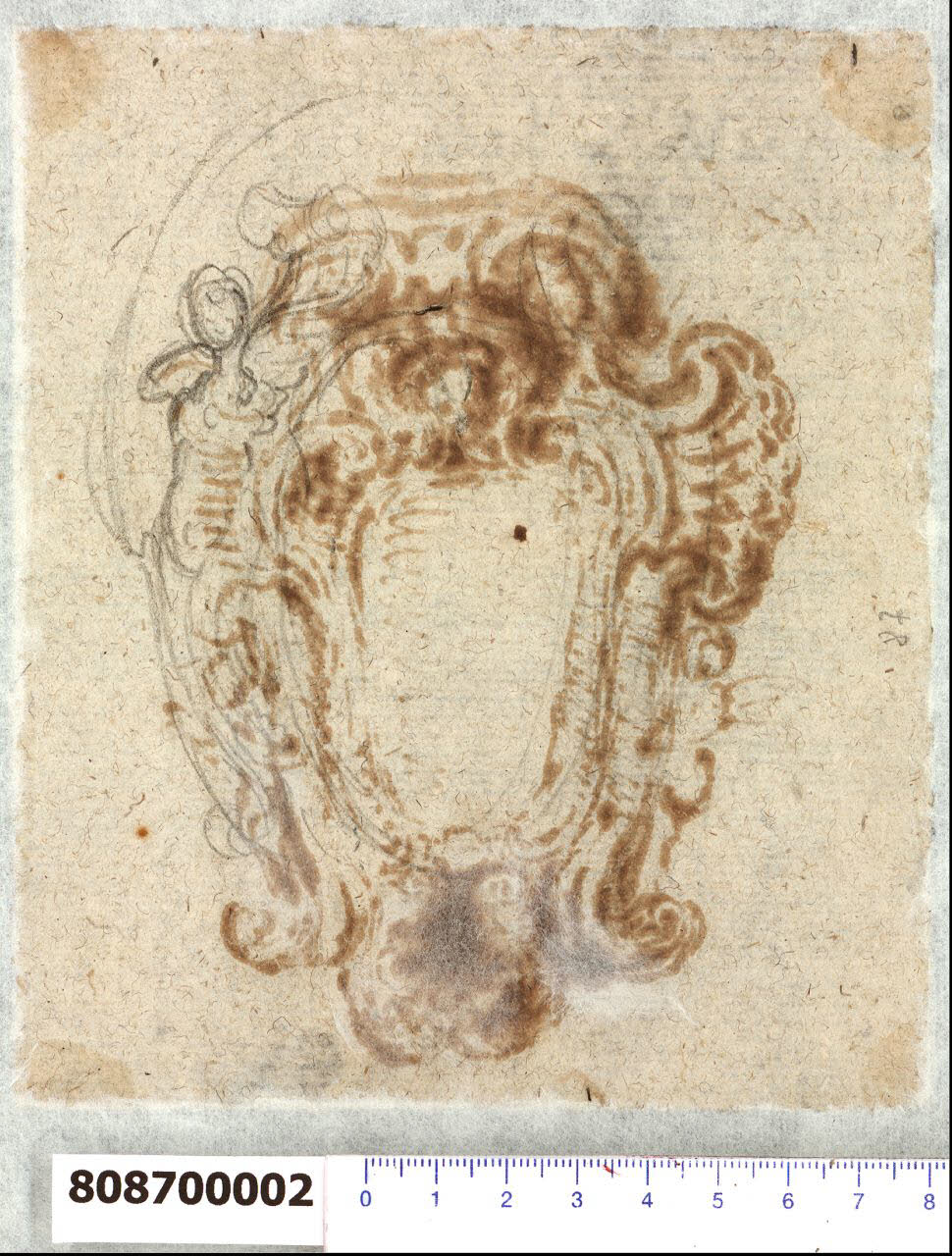 - NOTIZIE STORICO CRITICHE Il disegno è escluso dall'"Indice" di Giacomo Sardini. Il foglio in esame presenta lo schizzo a grafite di una cartella per arme gentilizia che probabilmente costituisce una variante decorativa di quella tracciata a inchiostro sul recto, attraverso l'inserimento di un'erma femminile. La paternità del disegno, attribuito da Hellmut Lorenz a Domenico Martinelli, è confermata da analogie stilistiche e dalla ripresa dei contorni del disegno tracciato sul recto del foglio.\nIl disegno può essere correlato oltre a quello di cui all'inv. 8,87 R, ad altri presenti all'interno della Collezione (Milano, Collezione Sardini Martinelli, invv. 8,81 e 8,88 R e V) che forse sono varianti dello stesso soggetto.