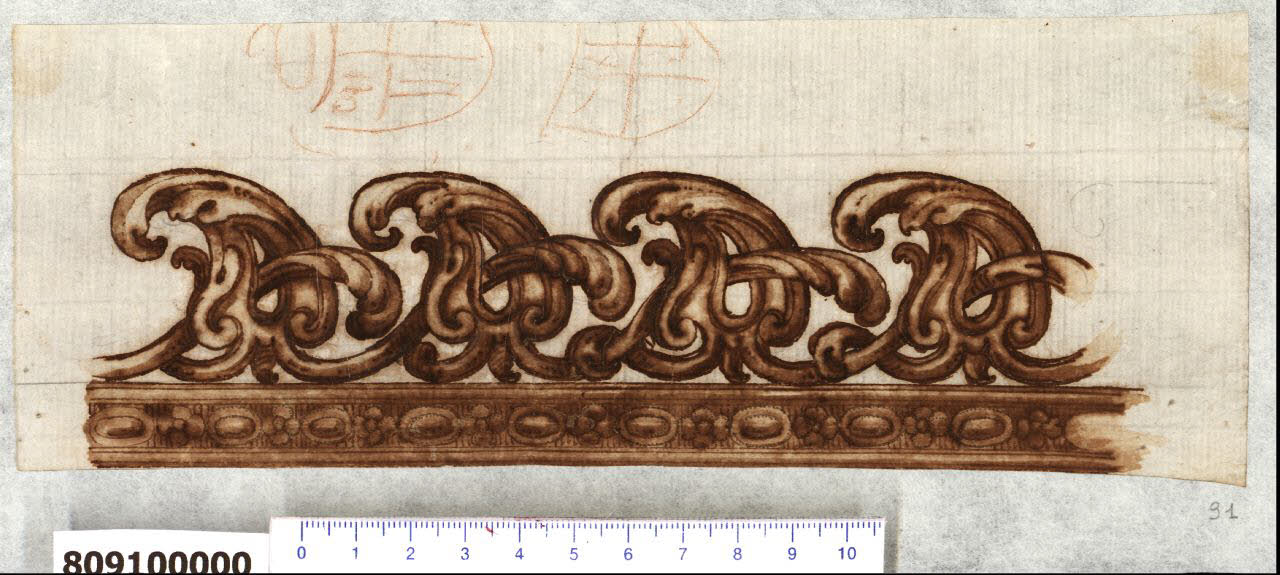 - NOTIZIE STORICO CRITICHE Nell'"Indice" del tomo nel quale era rilegato, il disegno viene definito: "Cornice di bronzo per cielo di / carrozza".\nIl disegno, di cui non è stato possibile identificare l'autore, rappresenta un ornamento rilevato, il cui soggetto potrebbe essere quello riportato dall'Indice di Giacomo Sardini. L'ornamento è costituito da una sequenza di motivi a fogliami stilizzati uguali e intrecciati tra di loro, posti su una fettuccia decorata con motivo intercalato di fiori e perle ovali.