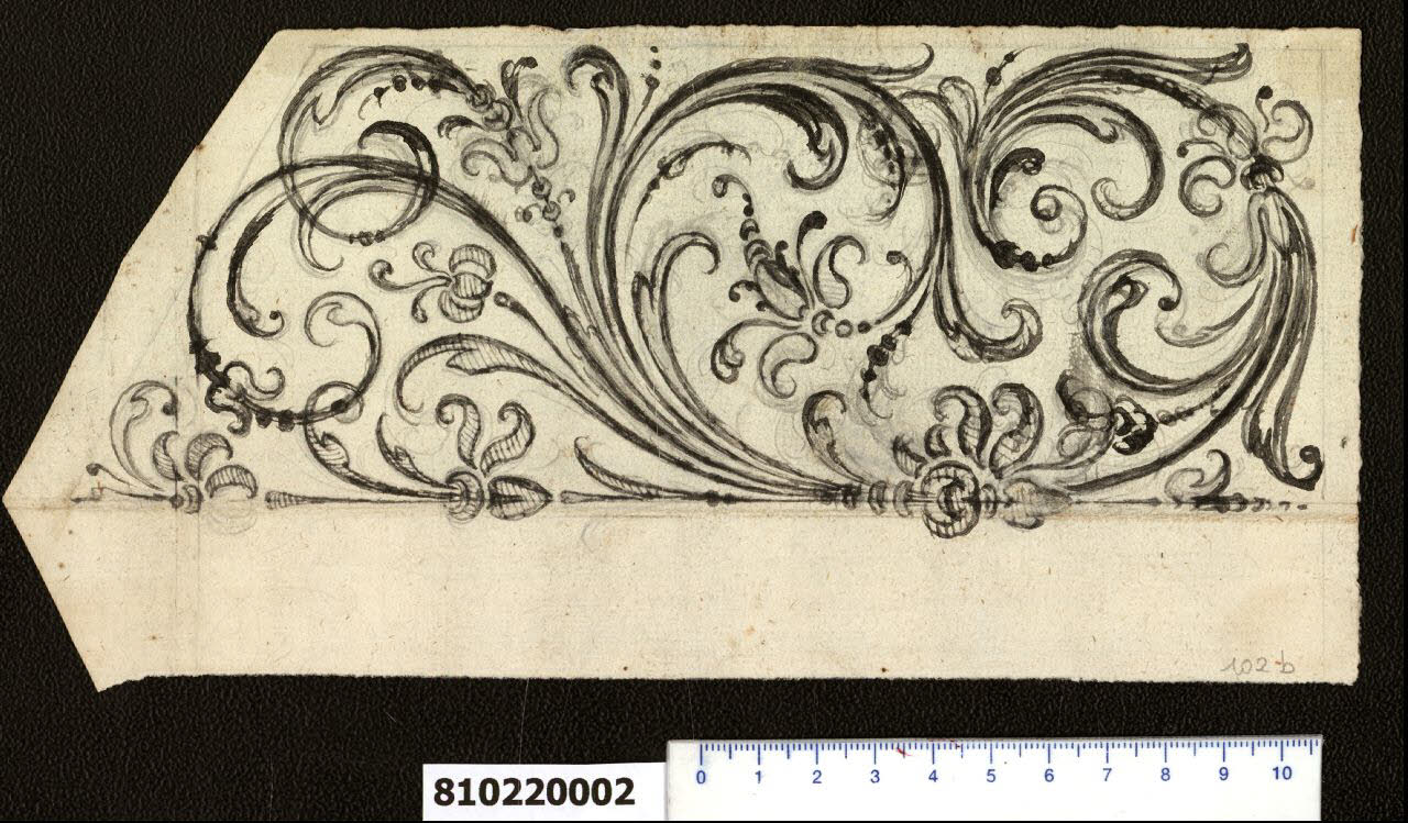 - NOTIZIE STORICO CRITICHE Il disegno, escluso dall'"Indice" di Giacomo Sardini, costituisce un'alternativa al decoro a girali arabeschi fogliformi e fiorami riportato sul recto del foglio da realizzare come ricamo del bordo sagomato in stoffa che circonda la copertura di un baldacchino.