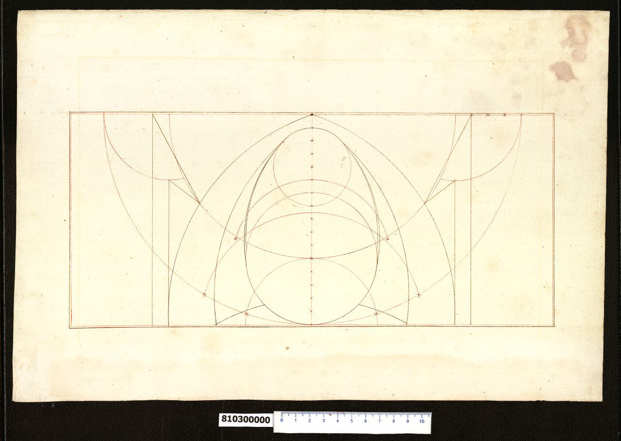 - NOTIZIE STORICO CRITICHE Nell'"Indice" del tomo nel quale il marchese Giacomo Sardini lo aveva rilegato, il disegno viene definito: "Figure geometriche per intagliare con proporzione gli ovoli nelle cornici". Non è semplice datare, con soddisfacente precisione, questo foglio che riporta un tracciato geometrico per il disegno di un motivo decorativo a ovoli e frecce, motivo ampiamente utilizzato fin dal Cinquecento sia in architettura che nella pittura quadraturistica. Potrebbe trattarsi di un'esercitazione, uno studio accademico, oppure di una bozza preparatoria per un lavoro ornamentale da tradurre in stucco, in pittura o in architettura.