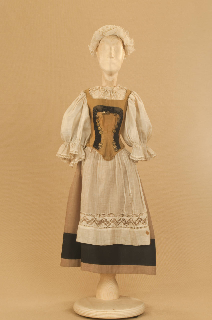 Costume folcloristico da donna composto da gonna, corpino, grembiule e cuffia.