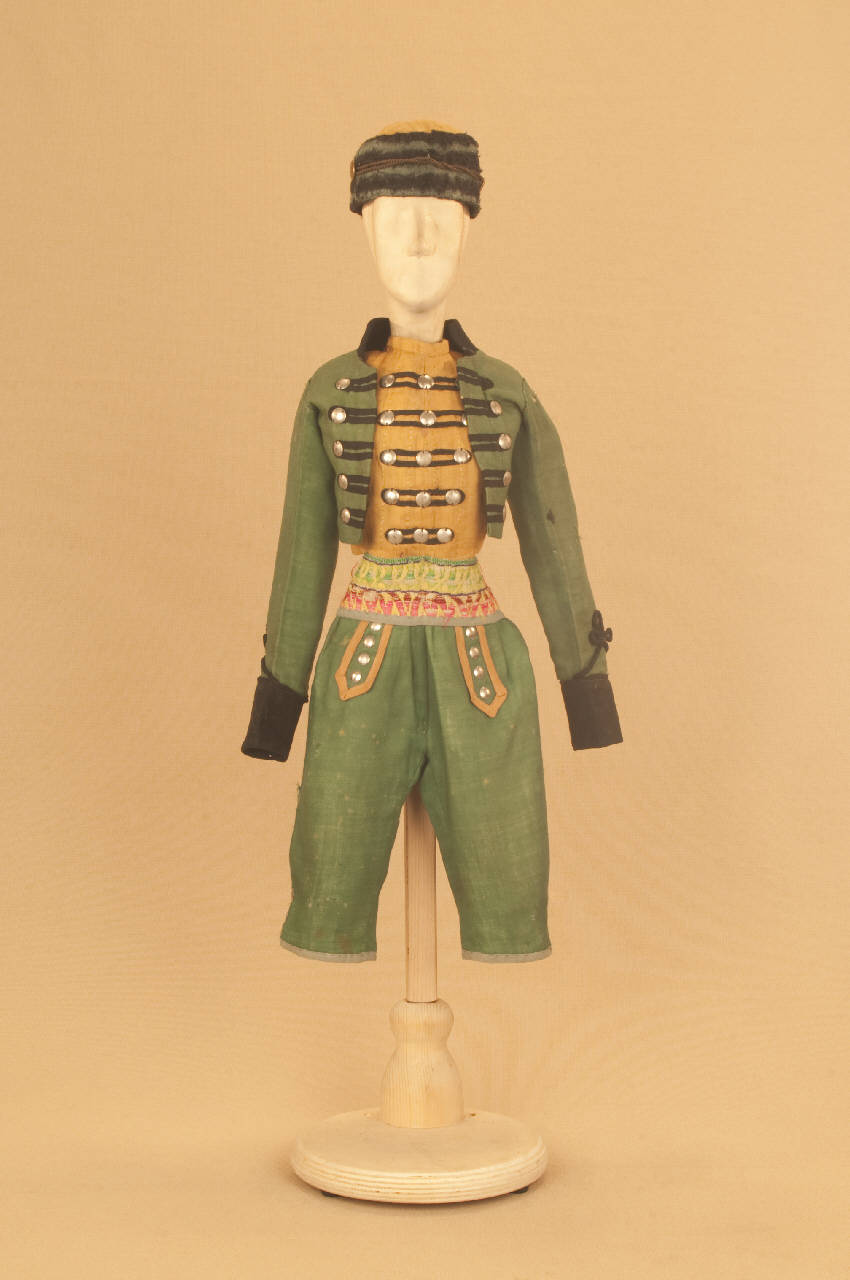 Divisa sportiva da uomo composta da pantaloni, panciotto, giacchino e cappello.