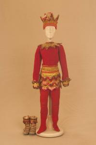 - NOTIZIE STORICO CRITICHE Costume realizzato per Il ballo "Excelsior", spettacolo che fu rappresentato la prima volta a Milano, al Teatro alla Scala, la sera dell'11 gennaio 1881. Autore del libretto e della coreografia era Luigi Manzotti, mentre Romualdo Marengo lo era della musica e Alfredo Edel delle scene e dei costumi.\nIl successo del ballo fu travolgente. Le repliche furono 103 nella stagione.\nLa versione marionettistica per la Compagnia Carlo Colla e Figli in due tempi e undici quadri fu allestita da Carlo II Colla col consenso dell'autore e presentata col titolo di "Civiltà e Progresso" nel 1895. Il titolo mutò poi nel tempo. Il primo allestimento del ballo ricordava ancora troppo l'originale scaligero. Ma fu sufficiente che lo spettacolo entrasse nella routine degli spostamenti della Compagnia perché le peculiarità del teatro marionettistico diventassero preponderanti.\nCosì l'"Excelsior" approdò al Teatro Gerolamo di Milano, quando la Compagnia ci entrò stabilmente nel 1906, proprio negli anni in cui, dopo qualche ultima apparizione, il "ballo grande" italiano, simbolico-narrativo sta tramontando sulle scene europee, divenendo unico retaggio del teatro delle marionette e, più particolarmente, della Compagnia Carlo Colla e Figli che ha continuato a riproporlo sino ad oggi, offrendo al pubblico di un secolo dopo la più vivida testimonianza del kolossal scaligero. Da nota scritta a matita sul "Giro Piazze della Compagnia Carlo Colla e Figli 1883-1912" si evince che la prima rappresentazione del ballo "Excelsior" è stata fatta a Caluso (TO) nel 1895.