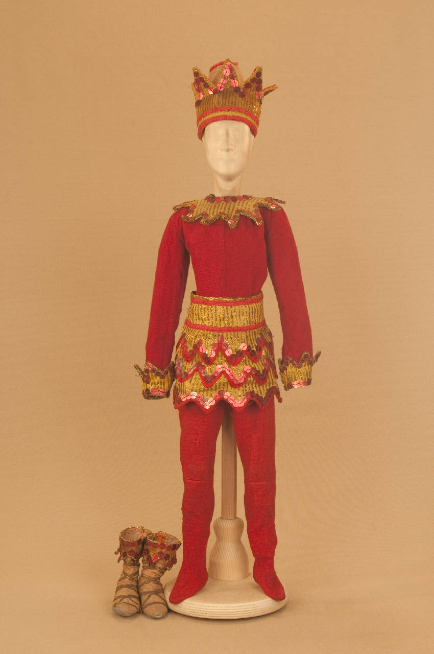 - NOTIZIE STORICO CRITICHE Costume realizzato per Il ballo "Excelsior", spettacolo che fu rappresentato la prima volta a Milano, al Teatro alla Scala, la sera dell'11 gennaio 1881. Autore del libretto e della coreografia era Luigi Manzotti, mentre Romualdo Marengo lo era della musica e Alfredo Edel delle scene e dei costumi.\nIl successo del ballo fu travolgente. Le repliche furono 103 nella stagione.\nLa versione marionettistica per la Compagnia Carlo Colla e Figli in due tempi e undici quadri fu allestita da Carlo II Colla col consenso dell'autore e presentata col titolo di "Civiltà e Progresso" nel 1895. Il titolo mutò poi nel tempo. Il primo allestimento del ballo ricordava ancora troppo l'originale scaligero. Ma fu sufficiente che lo spettacolo entrasse nella routine degli spostamenti della Compagnia perché le peculiarità del teatro marionettistico diventassero preponderanti.\nCosì l'"Excelsior" approdò al Teatro Gerolamo di Milano, quando la Compagnia ci entrò stabilmente nel 1906, proprio negli anni in cui, dopo qualche ultima apparizione, il "ballo grande" italiano, simbolico-narrativo sta tramontando sulle scene europee, divenendo unico retaggio del teatro delle marionette e, più particolarmente, della Compagnia Carlo Colla e Figli che ha continuato a riproporlo sino ad oggi, offrendo al pubblico di un secolo dopo la più vivida testimonianza del kolossal scaligero. Da nota scritta a matita sul "Giro Piazze della Compagnia Carlo Colla e Figli 1883-1912" si evince che la prima rappresentazione del ballo "Excelsior" è stata fatta a Caluso (TO) nel 1895.
