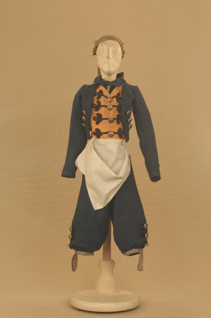 - NOTIZIE STORICO CRITICHE Il costume, realizzato per Il ballo "Excelsior" rappresentato la prima volta a Milano, al Teatro alla Scala, la sera dell'11 gennaio 1881, è stato rifatto in parte da Eugenio Monti Colla in occasione dell'andata in scena nel 1977 al Teatro Sociale di Como. Il tessuto della giacca e dei pantaloni, in origine di colore marrone, è stato tolto e sostituito con l'attuale mussola di lana blu. Autore del libretto e della coreografia è Luigi Manzotti, mentre Romualdo Marengo lo è della musica e Alfredo Edel delle scene e dei costumi.\nIl successo del ballo fu travolgente. Le repliche furono 103 nella stagione.\nLa versione marionettistica per la Compagnia Carlo Colla e Figli in due tempi e undici quadri fu allestita da Carlo II Colla col consenso dell'autore e presentata col titolo di "Civiltà e Progresso" nel 1895. Il titolo mutò poi nel tempo. Il primo allestimento del ballo ricordava ancora troppo l'originale scaligero. Ma fu sufficiente che lo spettacolo entrasse nella routine degli spostamenti della Compagnia perché le peculiarità del teatro marionettistico diventassero preponderanti.\nCosì l'"Excelsior" approdò al Teatro Gerolamo di Milano, quando la Compagnia ci entrò stabilmente nel 1906, proprio negli anni in cui, dopo qualche ultima apparizione, il "ballo grande" italiano, simbolico-narrativo sta tramontando sulle scene europee, divenendo unico retaggio del teatro delle marionette e, più particolarmente, della Compagnia Carlo Colla e Figli che ha continuato a riproporlo sino ad oggi, offrendo al pubblico di un secolo dopo la più vivida testimonianza del kolossal scaligero. Da nota scritta a matita sul "Giro Piazze della Compagnia Carlo Colla e Figli 1883-1912" si evince che la prima rappresentazione del ballo "Excelsior" è stata fatta a Caluso (TO) nel 1895.