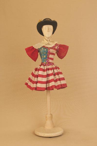 - NOTIZIE STORICO CRITICHE Costume realizzato per Il ballo "Excelsior", spettacolo che fu rappresentato la prima volta a Milano, al Teatro alla Scala, la sera dell'11 gennaio 1881. Autore del libretto e della coreografia era Luigi Manzotti, mentre Romualdo Marengo lo era della musica e Alfredo Edel delle scene e dei costumi.\nIl successo del ballo fu travolgente. Le repliche furono 103 nella stagione.\nLa versione marionettistica per la Compagnia Carlo Colla e Figli in due tempi e undici quadri fu allestita da Carlo II Colla col consenso dell'autore e presentata col titolo di "Civiltà e Progresso" nel 1895. Il titolo mutò poi nel tempo. Il primo allestimento del ballo ricordava ancora troppo l'originale scaligero. Ma fu sufficiente che lo spettacolo entrasse nella routine degli spostamenti della Compagnia perché le peculiarità del teatro marionettistico diventassero preponderanti.\nCosì l'"Excelsior" approdò al Teatro Gerolamo di Milano, quando la Compagnia ci entrò stabilmente nel 1906, proprio negli anni in cui, dopo qualche ultima apparizione, il "ballo grande" italiano, simbolico-narrativo sta tramontando sulle scene europee, divenendo unico retaggio del teatro delle marionette e, più particolarmente, della Compagnia Carlo Colla e Figli che ha continuato a riproporlo sino ad oggi, offrendo al pubblico di un secolo dopo la più vivida testimonianza del kolossal scaligero. Da nota scritta a matita sul "Giro Piazze della Compagnia Carlo Colla e Figli 1883-1912" si evince che la prima rappresentazione del ballo "Excelsior" è stata fatta a Caluso (TO) nel 1895.