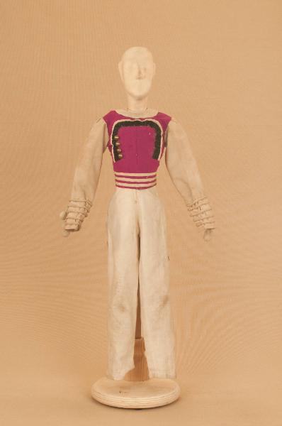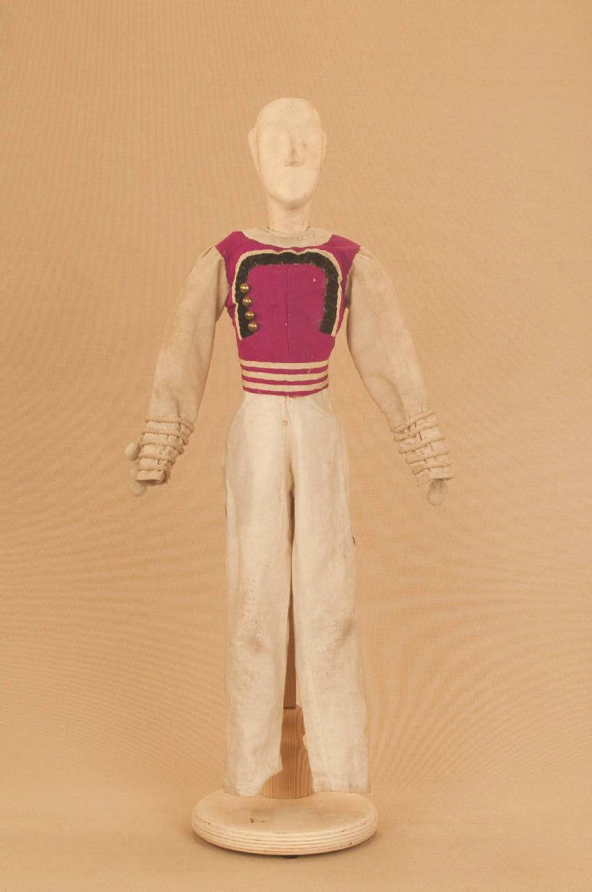 - NOTIZIE STORICO CRITICHE Costume realizzato per Il ballo "Excelsior", spettacolo che fu rappresentato la prima volta a Milano, al Teatro alla Scala, la sera dell'11 gennaio 1881. Autore del libretto e della coreografia era Luigi Manzotti, mentre Romualdo Marengo lo era della musica e Alfredo Edel delle scene e dei costumi.\nIl successo del ballo fu travolgente. Le repliche furono 103 nella stagione.\nLa versione marionettistica per la Compagnia Carlo Colla e Figli in due tempi e undici quadri fu allestita da Carlo II Colla col consenso dell'autore e presentata col titolo di "Civiltà e Progresso" nel 1895. Il titolo mutò poi nel tempo. Il primo allestimento del ballo ricordava ancora troppo l'originale scaligero. Ma fu sufficiente che lo spettacolo entrasse nella routine degli spostamenti della Compagnia perché le peculiarità del teatro marionettistico diventassero preponderanti.\nCosì l'"Excelsior" approdò al Teatro Gerolamo di Milano, quando la Compagnia ci entrò stabilmente nel 1906, proprio negli anni in cui, dopo qualche ultima apparizione, il "ballo grande" italiano, simbolico-narrativo sta tramontando sulle scene europee, divenendo unico retaggio del teatro delle marionette e, più particolarmente, della Compagnia Carlo Colla e Figli che ha continuato a riproporlo sino ad oggi, offrendo al pubblico di un secolo dopo la più vivida testimonianza del kolossal scaligero. Da nota scritta a matita sul "Giro Piazze della Compagnia Carlo Colla e Figli 1883-1912" si evince che la prima rappresentazione del ballo "Excelsior" è stata fatta a Caluso (TO) nel 1895.