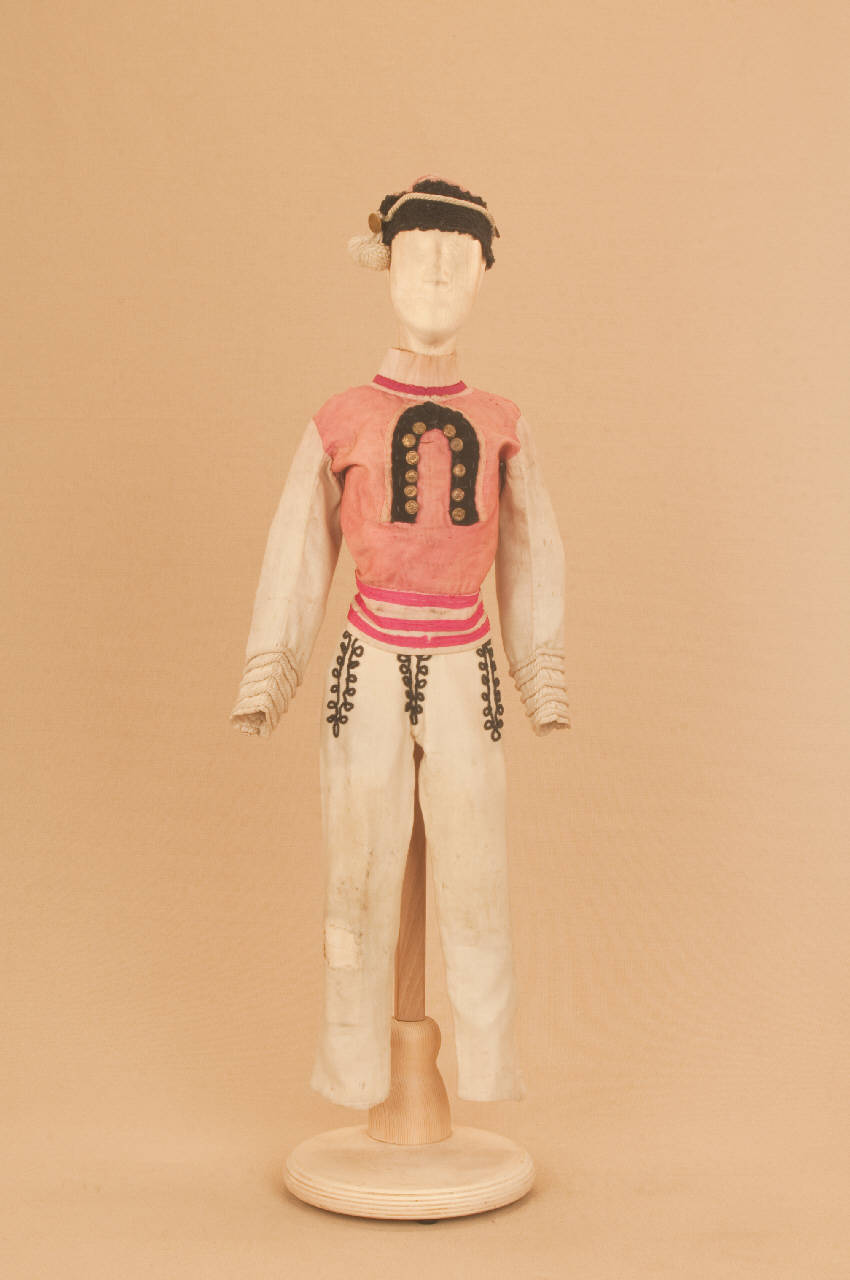 - NOTIZIE STORICO CRITICHE Costume realizzato per Il ballo "Excelsior", spettacolo che fu rappresentato la prima volta a Milano, al Teatro alla Scala, la sera dell'11 gennaio 1881. Autore del libretto e della coreografia era Luigi Manzotti, mentre Romualdo Marengo lo era della musica e Alfredo Edel delle scene e dei costumi.\nIl successo del ballo fu travolgente. Le repliche furono 103 nella stagione.\nLa versione marionettistica per la Compagnia Carlo Colla e Figli in due tempi e undici quadri fu allestita da Carlo II Colla col consenso dell'autore e presentata col titolo di "Civiltà e Progresso" nel 1895. Il titolo mutò poi nel tempo. Il primo allestimento del ballo ricordava ancora troppo l'originale scaligero. Ma fu sufficiente che lo spettacolo entrasse nella routine degli spostamenti della Compagnia perché le peculiarità del teatro marionettistico diventassero preponderanti.\nCosì l'"Excelsior" approdò al Teatro Gerolamo di Milano, quando la Compagnia ci entrò stabilmente nel 1906, proprio negli anni in cui, dopo qualche ultima apparizione, il "ballo grande" italiano, simbolico-narrativo sta tramontando sulle scene europee, divenendo unico retaggio del teatro delle marionette e, più particolarmente, della Compagnia Carlo Colla e Figli che ha continuato a riproporlo sino ad oggi, offrendo al pubblico di un secolo dopo la più vivida testimonianza del kolossal scaligero. Da nota scritta a matita sul "Giro Piazze della Compagnia Carlo Colla e Figli 1883-1912" si evince che la prima rappresentazione del ballo "Excelsior" è stata fatta a Caluso (TO) nel 1895.