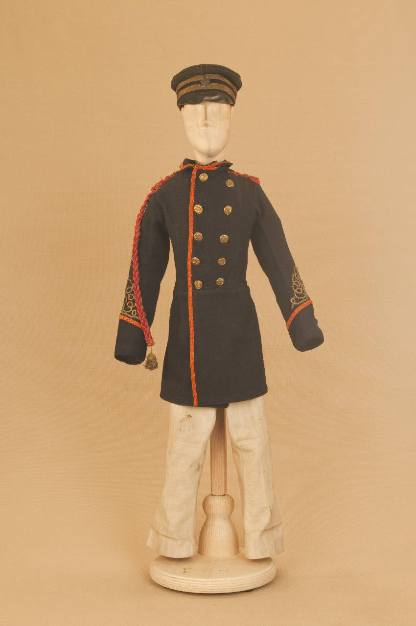Costume militare da ufficiale di marina composto da pantaloni, giacca e cappello.