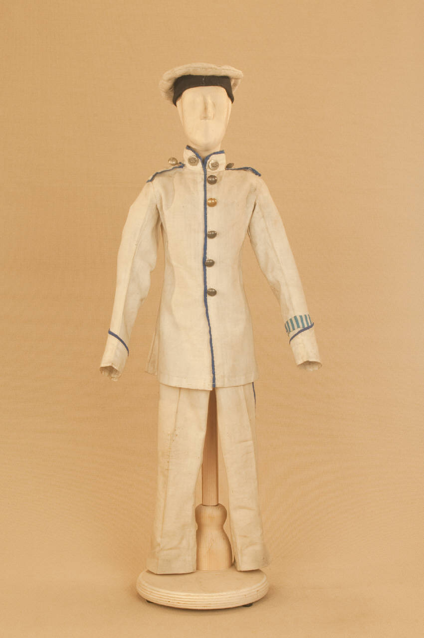 Costume militare da ufficiale di marina composto da pantaloni, giacca e cappello.