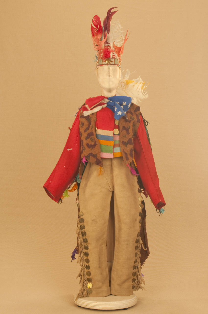 Costume folcloristico da indiano d'America composto da pantaloni, corpino, cravatta, collo, mantello e copricapo.