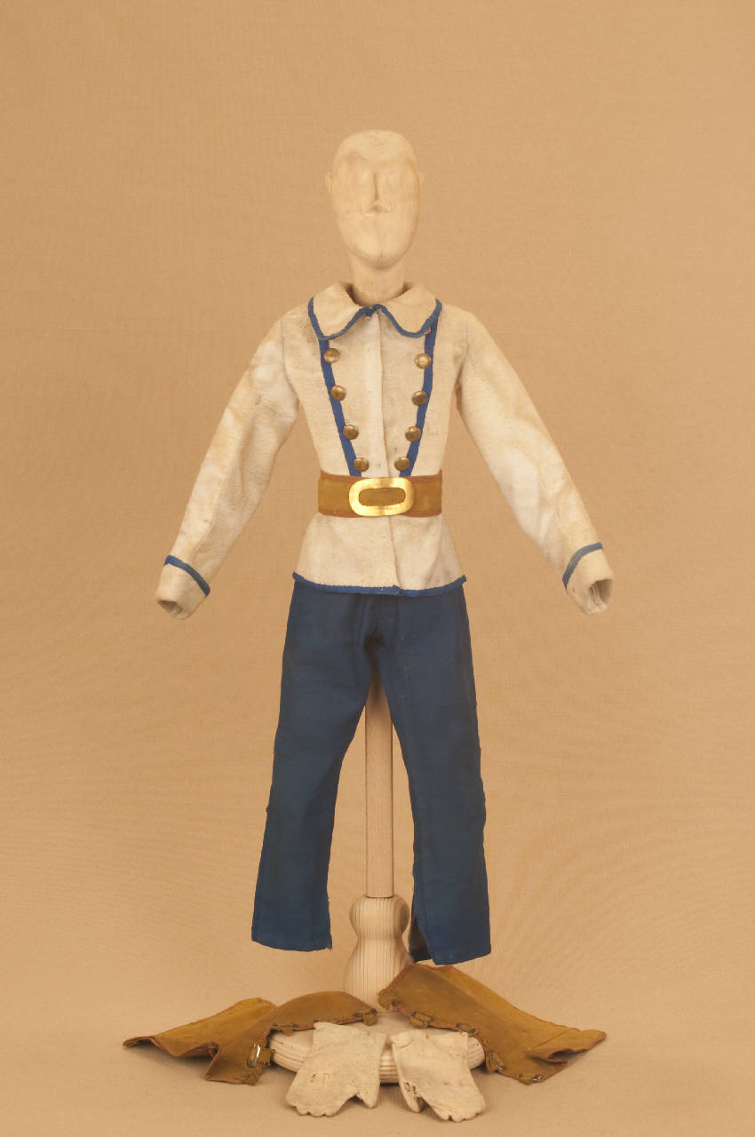 Divisa da uomo composta da pantaloni, giacca, guanti, ghette e cintura.