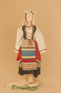 Costume folcloristico da donna italiana composto da veste, ciocie, nastri e copricapo.