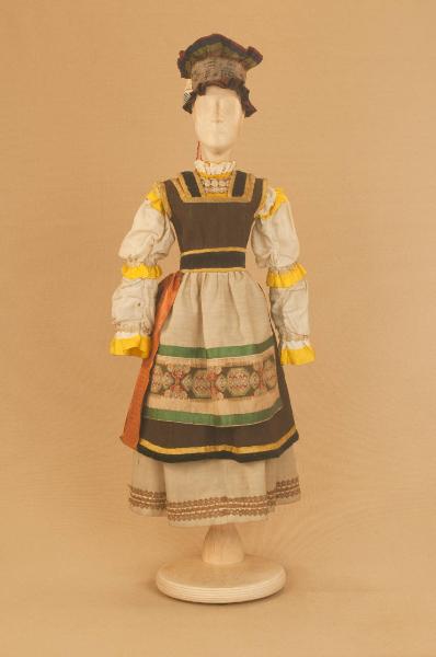 Costume folcloristico da donna composto da veste, camicia e cuffia.