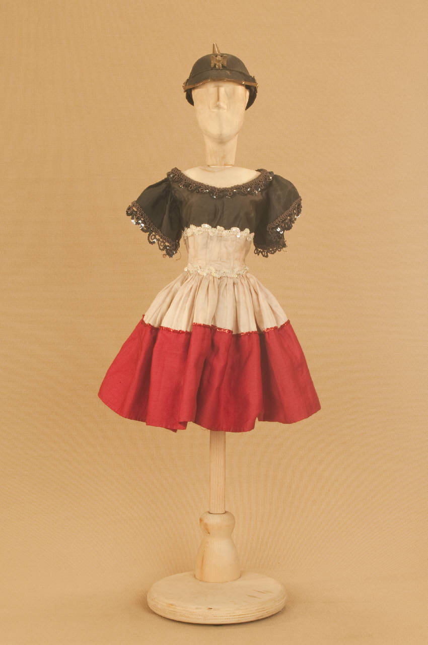 - NOTIZIE STORICO CRITICHE Il costume, realizzato per Il ballo "Excelsior", spettacolo che fu rappresentato la prima volta a Milano, al Teatro alla Scala, la sera dell'11 gennaio 1881, non è stato usato durante gli anni della Guerra ed è stato reinserito nel 1956. Autore del libretto e della coreografia era Luigi Manzotti, mentre Romualdo Marengo lo era della musica e Alfredo Edel delle scene e dei costumi.\nIl successo del ballo fu travolgente. Le repliche furono 103 nel 1881.\nLa versione marionettistica per la Compagnia Carlo Colla e Figli in due tempi e undici quadri fu allestita da Carlo II Colla col consenso dell'autore e presentata col titolo di "Civiltà e Progresso" nel 1895. Il titolo mutò poi nel tempo. Il primo allestimento del ballo ricordava ancora troppo l'originale scaligero. Ma fu sufficiente che lo spettacolo entrasse nella routine degli spostamenti della Compagnia perché le peculiarità del teatro marionettistico diventassero preponderanti.\nCosì l'"Excelsior" approdò al Teatro Gerolamo di Milano, quando la Compagnia ci entrò stabilmente nel 1906, proprio negli anni in cui, dopo qualche ultima apparizione, il "ballo grande" italiano, simbolico-narrativo sta tramontando sulle scene europee, divenendo unico retaggio del teatro delle marionette e, più particolarmente, della Compagnia Carlo Colla e Figli che ha continuato a riproporlo sino ad oggi, offrendo al pubblico di un secolo dopo la più vivida testimonianza del kolossal scaligero. Da nota scritta a matita sul "Giro Piazze della Compagnia Carlo Colla e Figli 1883-1912" si evince che la prima rappresentazione del ballo "Excelsior" è stata fatta a Caluso (TO) nel 1895.