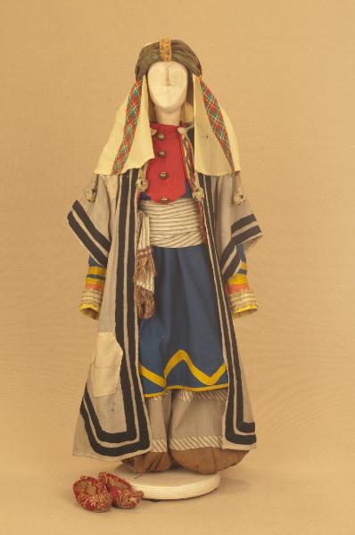 Costume folcloristico da uomo arabo composto da pantaloni, veste, bolero, fusciacca, scarpe, tunica e copricapo.