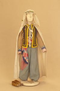 Costume folcloristico da uomo arabo composto da pantaloni, corpino, bolero, fusciacca, scarpe, "burnus", cordone e sostegno in cartapesta per cappuccio.