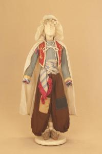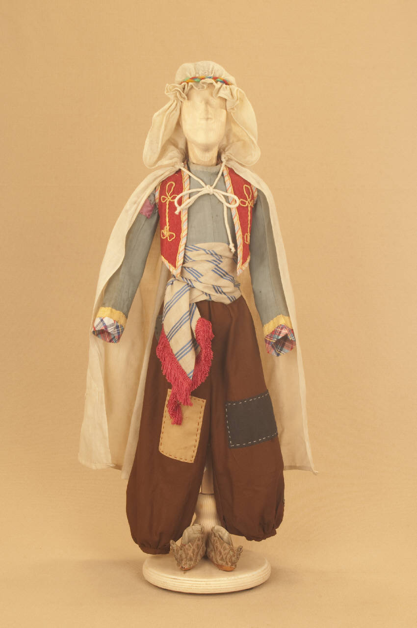 Costume folcloristico da uomo arabo composto da pantaloni, corpino, bolero, fusciacca, scarpe, "burnus", cordone e sostegno in cartapesta per cappuccio.