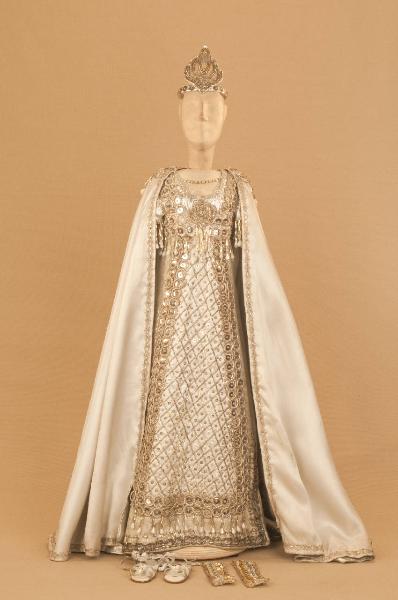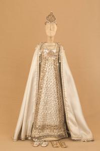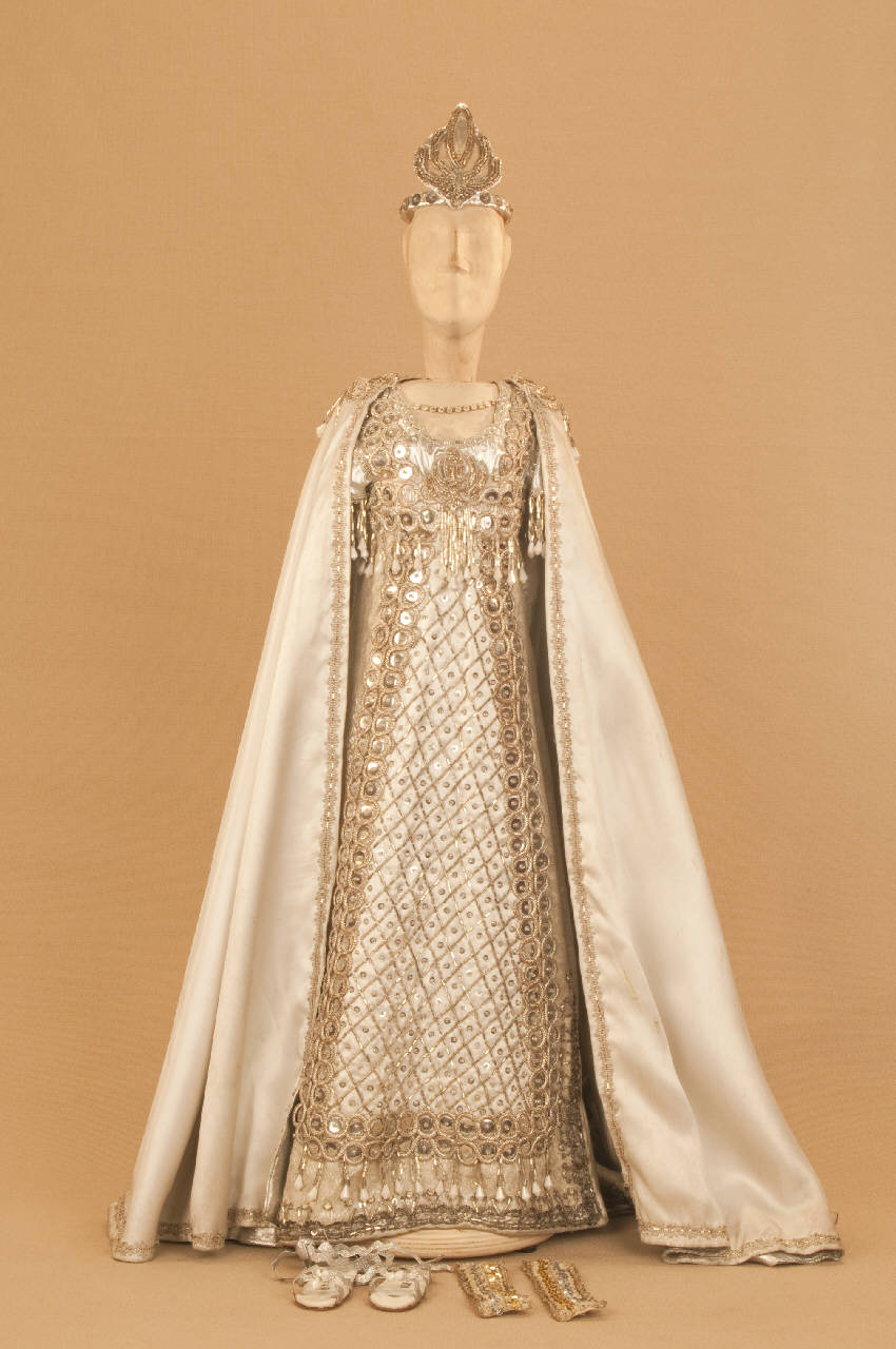 Costume allegorico da donna composto da veste, bracciali, mantello e sandali. Si completa con un diadema che ha il codice EM 00899.