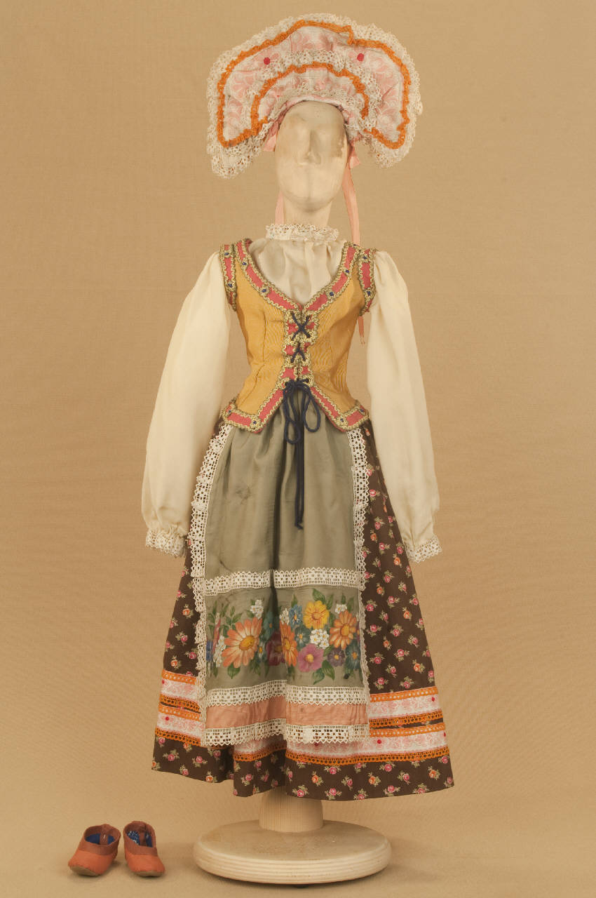 Costume folcloristico da donna composto da gonna, camicetta, bustino, grembiule, acconciatura e scarpe.