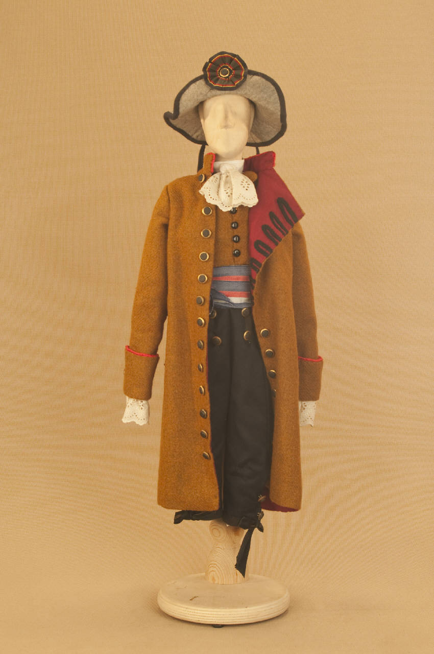 Costume da uomo borghese composto da pantaloni, soprabito, panciotto, collo, fascia e cappello.