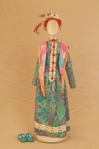 Costume da donna borghese composto da gonna, corpino, scialle, cappello e scarpe.
