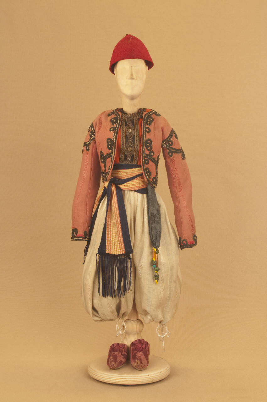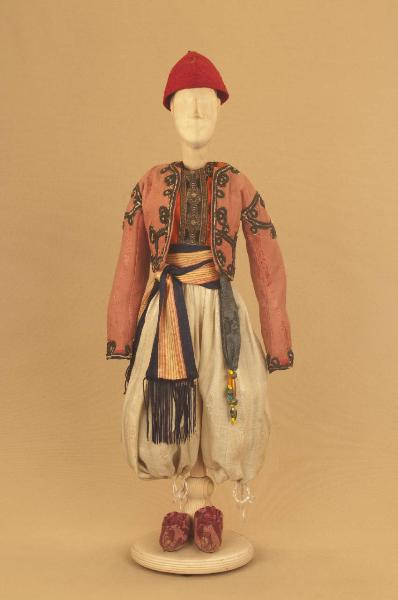 Costume folcloristico da uomo orientale composto da pantaloni, gilet, bolero, fusciacca, borsa e scarpe. Si completa con un fez che ha il codice C 08061.
