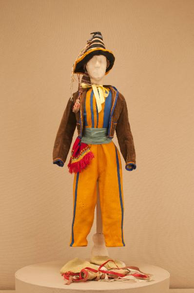 Costume folcloristico da uomo italiano composto da pantaloni, giacchino, gilet, cravatta, fusciacca, ciocie, cappello e reticella.