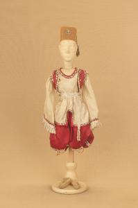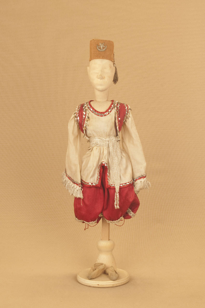 - NOTIZIE STORICO CRITICHE Costume realizzato nel 1895 per Il ballo "Excelsior", spettacolo che fu rappresentato la prima volta a Milano, al Teatro alla Scala, la sera dell'11 gennaio 1881. Autore del libretto e della coreografia era Luigi Manzotti, mentre Romualdo Marengo lo era della musica e Alfredo Edel delle scene e dei costumi.\nIl successo del ballo fu travolgente. Le repliche furono 103 nel 1881.\nLa versione marionettistica per la Compagnia Carlo Colla e Figli in due tempi e undici quadri fu allestita da Carlo II Colla col consenso dell'autore e presentata col titolo di "Civiltà e Progresso" nel 1895. Il titolo mutò poi nel tempo. Il primo allestimento del ballo ricordava ancora troppo l'originale scaligero. Ma fu sufficiente che lo spettacolo entrasse nella routine degli spostamenti della Compagnia perché le peculiarità del teatro marionettistico diventassero preponderanti.\nCosì l'"Excelsior" approdò al Teatro Gerolamo di Milano, quando la Compagnia ci entrò stabilmente nel 1906, proprio negli anni in cui, dopo qualche ultima apparizione, il "ballo grande" italiano, simbolico-narrativo sta tramontando sulle scene europee, divenendo unico retaggio del teatro delle marionette e, più particolarmente, della Compagnia Carlo Colla e Figli che ha continuato a riproporlo sino ad oggi, offrendo al pubblico di un secolo dopo la più vivida testimonianza del kolossal scaligero. Da nota scritta a matita sul "Giro Piazze della Compagnia Carlo Colla e Figli 1883-1912" si evince che la prima rappresentazione del ballo "Excelsior" è stata fatta a Caluso (TO) nel 1895.