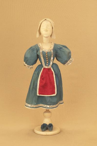 - NOTIZIE STORICO CRITICHE Costume realizzato nel 1895 per Il ballo "Excelsior", spettacolo che fu rappresentato la prima volta a Milano, al Teatro alla Scala, la sera dell'11 gennaio 1881. Autore del libretto e della coreografia era Luigi Manzotti, mentre Romualdo Marengo lo era della musica e Alfredo Edel delle scene e dei costumi.\nIl successo del ballo fu travolgente. Le repliche furono 103 nel 1881.\nLa versione marionettistica per la Compagnia Carlo Colla e Figli in due tempi e undici quadri fu allestita da Carlo II Colla col consenso dell'autore e presentata col titolo di "Civiltà e Progresso" nel 1895. Il titolo mutò poi nel tempo. Il primo allestimento del ballo ricordava ancora troppo l'originale scaligero. Ma fu sufficiente che lo spettacolo entrasse nella routine degli spostamenti della Compagnia perché le peculiarità del teatro marionettistico diventassero preponderanti.\nCosì l'"Excelsior" approdò al Teatro Gerolamo di Milano, quando la Compagnia ci entrò stabilmente nel 1906, proprio negli anni in cui, dopo qualche ultima apparizione, il "ballo grande" italiano, simbolico-narrativo sta tramontando sulle scene europee, divenendo unico retaggio del teatro delle marionette e, più particolarmente, della Compagnia Carlo Colla e Figli che ha continuato a riproporlo sino ad oggi, offrendo al pubblico di un secolo dopo la più vivida testimonianza del kolossal scaligero. Da nota scritta a matita sul "Giro Piazze della Compagnia Carlo Colla e Figli 1883-1912" si evince che la prima rappresentazione del ballo "Excelsior" è stata fatta a Caluso (TO) nel 1895.