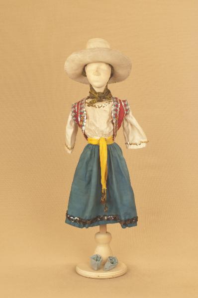 - NOTIZIE STORICO CRITICHE Del costume, realizzato nel 1895 per Il ballo "Excelsior", spettacolo che fu rappresentato la prima volta a Milano, al Teatro alla Scala, la sera dell'11 gennaio 1881, è stata rifatta la cintura da Eugenio Monti Colla in occasione dell'andata in scena al Teatro Sociale di Como nel 1977, per le "Celebrazioni Voltiane". Autore del libretto e della coreografia era Luigi Manzotti, mentre Romualdo Marengo lo era della musica e Alfredo Edel delle scene e dei costumi.\nIl successo del ballo fu travolgente. Le repliche furono 103 nel 1881.\nLa versione marionettistica per la Compagnia Carlo Colla e Figli in due tempi e undici quadri fu allestita da Carlo II Colla col consenso dell'autore e presentata col titolo di "Civiltà e Progresso" nel 1895. Il titolo mutò poi nel tempo. Il primo allestimento del ballo ricordava ancora troppo l'originale scaligero. Ma fu sufficiente che lo spettacolo entrasse nella routine degli spostamenti della Compagnia perché le peculiarità del teatro marionettistico diventassero preponderanti.\nCosì l'"Excelsior" approdò al Teatro Gerolamo di Milano, quando la Compagnia ci entrò stabilmente nel 1906, proprio negli anni in cui, dopo qualche ultima apparizione, il "ballo grande" italiano, simbolico-narrativo sta tramontando sulle scene europee, divenendo unico retaggio del teatro delle marionette e, più particolarmente, della Compagnia Carlo Colla e Figli che ha continuato a riproporlo sino ad oggi, offrendo al pubblico di un secolo dopo la più vivida testimonianza del kolossal scaligero. Da nota scritta a matita sul "Giro Piazze della Compagnia Carlo Colla e Figli 1883-1912" si evince che la prima rappresentazione del ballo "Excelsior" è stata fatta a Caluso (TO) nel 1895.