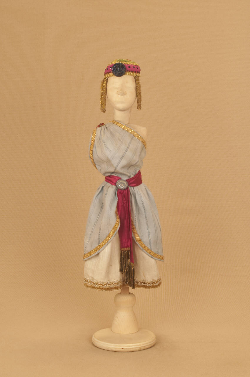 - NOTIZIE STORICO CRITICHE Il costume, realizzato nel 1895 per Il ballo "Excelsior", spettacolo che fu rappresentato la prima volta a Milano, al Teatro alla Scala, la sera dell'11 gennaio 1881, è stato rifatto in parte da Eugenio Monti Colla in occasione dell'andata in scena al Teatro Sociale di Como nel 1977, per le "Celebrazioni Voltiane". Sono stati fatti nuovi e sostituiti il cappello e la cintura applicata alla veste. Autore del libretto e della coreografia era Luigi Manzotti, mentre Romualdo Marengo lo era della musica e Alfredo Edel delle scene e dei costumi.\nIl successo del ballo fu travolgente. Le repliche furono 103 nel 1881.\nLa versione marionettistica per la Compagnia Carlo Colla e Figli in due tempi e undici quadri fu allestita da Carlo II Colla col consenso dell'autore e presentata col titolo di "Civiltà e Progresso" nel 1895. Il titolo mutò poi nel tempo. Il primo allestimento del ballo ricordava ancora troppo l'originale scaligero. Ma fu sufficiente che lo spettacolo entrasse nella routine degli spostamenti della Compagnia perché le peculiarità del teatro marionettistico diventassero preponderanti.\nCosì l'"Excelsior" approdò al Teatro Gerolamo di Milano, quando la Compagnia ci entrò stabilmente nel 1906, proprio negli anni in cui, dopo qualche ultima apparizione, il "ballo grande" italiano, simbolico-narrativo sta tramontando sulle scene europee, divenendo unico retaggio del teatro delle marionette e, più particolarmente, della Compagnia Carlo Colla e Figli che ha continuato a riproporlo sino ad oggi, offrendo al pubblico di un secolo dopo la più vivida testimonianza del kolossal scaligero. Da nota scritta a matita sul "Giro Piazze della Compagnia Carlo Colla e Figli 1883-1912" si evince che la prima rappresentazione del ballo "Excelsior" è stata fatta a Caluso (TO) nel 1895.