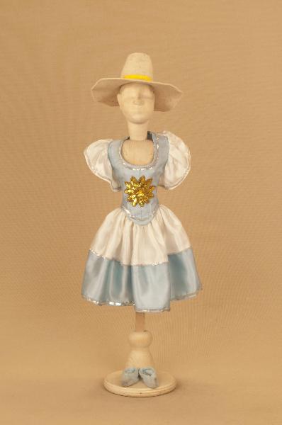 - NOTIZIE STORICO CRITICHE Costume realizzato nel 1999 per il riallestimento, al Piccolo Teatro di Milano, del ballo "Excelsior", spettacolo che fu rappresentato la prima volta a Milano, al Teatro alla Scala, la sera dell'11 gennaio 1881. Autore del libretto e della coreografia è Luigi Manzotti, mentre Romualdo Marengo lo è della musica e Alfredo Edel delle scene e dei costumi.\nIl successo del ballo fu travolgente. Le repliche furono 103 nella stagione.\nLa versione marionettistica per la Compagnia Carlo Colla e Figli in due tempi e undici quadri fu allestita da Carlo II Colla col consenso dell'autore e presentata col titolo di "Civiltà e Progresso" nel 1895. Il titolo mutò poi nel tempo. Il primo allestimento del ballo ricordava ancora troppo l'originale scaligero. Ma fu sufficiente che lo spettacolo entrasse nella routine degli spostamenti della Compagnia perché le peculiarità del teatro marionettistico diventassero preponderanti.\nCosì l'"Excelsior" approdò al Teatro Gerolamo di Milano, quando la Compagnia ci entrò stabilmente nel 1906, proprio negli anni in cui, dopo qualche ultima apparizione, il "ballo grande" italiano, simbolico-narrativo sta tramontando sulle scene europee, divenendo unico retaggio del teatro delle marionette e, più particolarmente, della Compagnia Carlo Colla e Figli che ha continuato a riproporlo sino ad oggi, offrendo al pubblico di un secolo dopo la più vivida testimonianza del kolossal scaligero. Da nota scritta a matita sul "Giro Piazze della Compagnia Carlo Colla e Figli 1883-1912" si evince che la prima rappresentazione del ballo "Excelsior" è stata fatta a Caluso (TO) nel 1895.