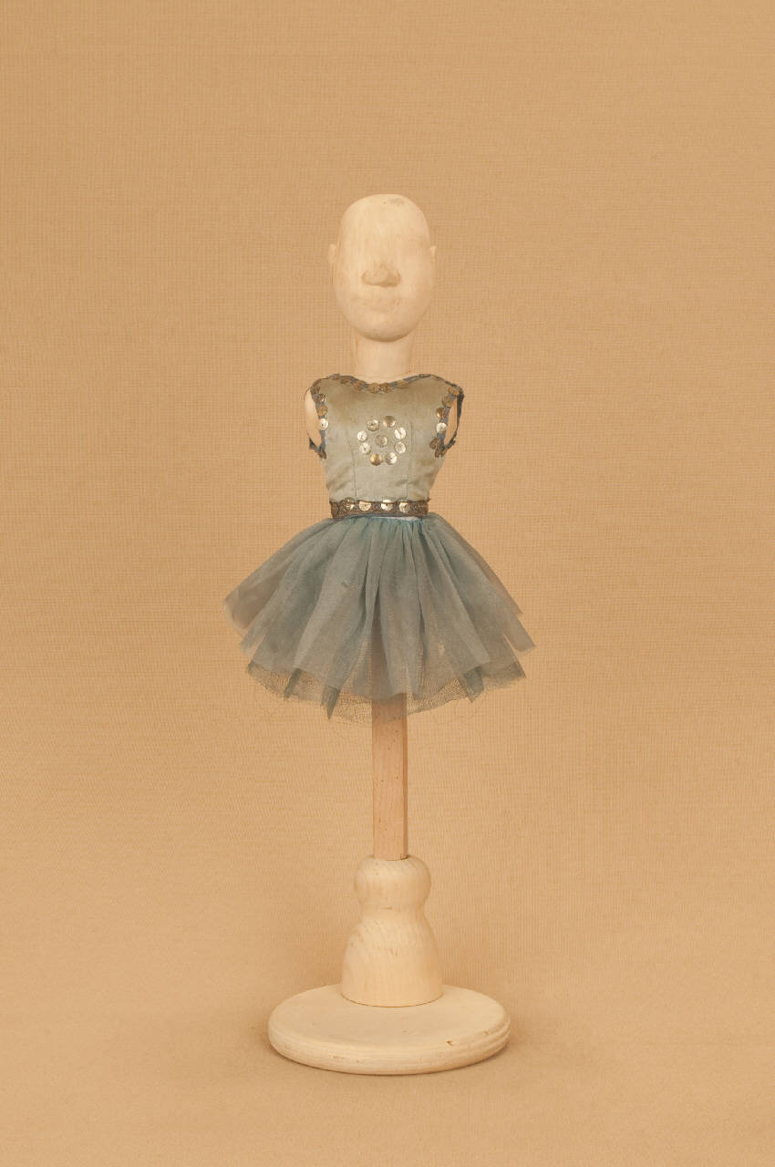 - NOTIZIE STORICO CRITICHE Il costume, realizzato per Il ballo "Excelsior", spettacolo che fu rappresentato la prima volta a Milano, al Teatro alla Scala, la sera dell'11 gennaio 1881, è stato confezionato in due momenti diversi: il corpino, originale del 1926, confezionato dalla Sartoria Ardovino su bozzetto di Caramba, Il tutù realizzato nel 1970 da Angela Colla per il riallestimento dello spettacolo al Festival di Spoleto, utilizzando materiale proveniente dalla sartoria del Teatro alla Scala. A memoria di Eugenio Monti Colla gli abiti della prima edizione erano realizzati in "plumetis" di cotone giallo pallido, di cui oggi non esistono più tracce.\nAutore del libretto e della coreografia del ballo "Excelsior" era Luigi Manzotti, mentre Romualdo Marengo lo era della musica e Alfredo Edel delle scene e dei costumi.\nIl successo del ballo fu travolgente. Le repliche furono 103 nella stagione.\nLa versione marionettistica per la Compagnia Carlo Colla e Figli in due tempi e undici quadri fu allestita da Carlo II Colla col consenso dell'autore e presentata col titolo di "Civiltà e Progresso" nel 1895. Il titolo mutò poi nel tempo. Il primo allestimento del ballo ricordava ancora troppo l'originale scaligero. Ma fu sufficiente che lo spettacolo entrasse nella routine degli spostamenti della Compagnia perché le peculiarità del teatro marionettistico diventassero preponderanti.\nCosì l'"Excelsior" approdò al Teatro Gerolamo di Milano, quando la Compagnia ci entrò stabilmente nel 1906, proprio negli anni in cui, dopo qualche ultima apparizione, il "ballo grande" italiano, simbolico-narrativo sta tramontando sulle scene europee, divenendo unico retaggio del teatro delle marionette e, più particolarmente, della Compagnia Carlo Colla e Figli che ha continuato a riproporlo sino ad oggi, offrendo al pubblico di un secolo dopo la più vivida testimonianza del kolossal scaligero. Da nota scritta a matita sul "Giro Piazze della Compagnia Carlo Colla e Figli 1883-1912" si evince che la prima rappresentazione del ballo "Excelsior" è stata fatta a Caluso (TO) nel 1895.