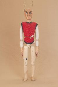 Testa di legno di tiglio fissata al corpo tramite ferro, occhi di vetro, bocca mobile. Corpo grande in abete snodato in vita ad incastro, gambe unite al bacino tramite bordione in ferro, ginocchia ad incastro, mani mobili al polso con dita scolpite e separate, bilancino originale metodo Holden.